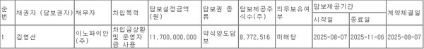 담보 제공 기간은 8월 7일부터 11월 6일까지 3개월이다. 이 기간을 초과하면 자동 반대매매가 이뤄진다. 담보권이 전부 실행될 경우 이노파이안의 지분율은 28.28%에서 6.78%로 줄어든다. 해당 지분율은 오는 14일 상장 예정인 유상증자 신주 52만9100주를 포함한 발행주식총수 4080만3162주 기준이다.