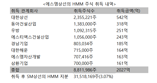 SM상선이 계열회사로부터 HMM의 주식을 사들였다.