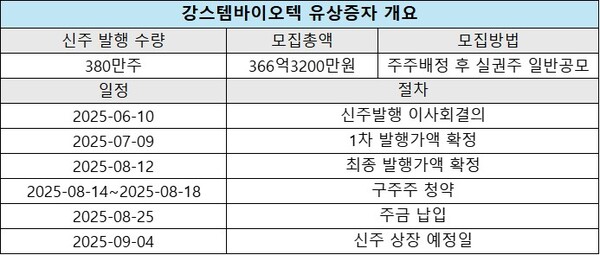 27일 금융감독원 전자공시시스템에 따르면 강스템바이오텍은 구주주 대상 청약에서 청약률 103.95%를 기록했다고 밝혔다. 발행 신주는 380만주로 기존 발행주식 총수 대비 68% 규모다. 납입은 25일 완료됐다.