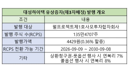 RCPS는 발행일로부터 1년 뒤인 2026년 9월 9일부터 2030년 9월 8일까지 대성하이텍 보통주로 전환할 수 있다. 전환가액은 발행가액과 같은 4429원이다.