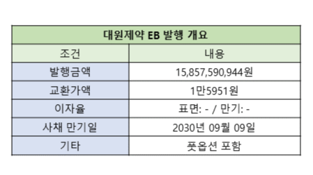 교환 대상은 대원제약 보통주 99만4144주(4.43%)며, 교환가액은 주당 1만5951원이다. 시가 하락에 따른 교환가액 조정(리픽싱)은 없지만, 기준주가보다 낮은 발행가액의 유상증자나 전환사채 발행 등 특정 이벤트 발생 시에는 교환가액이 하향 조정될 수 있다. 교환청구기간은 9월 16일부터 2030년 9월 2일까지다.