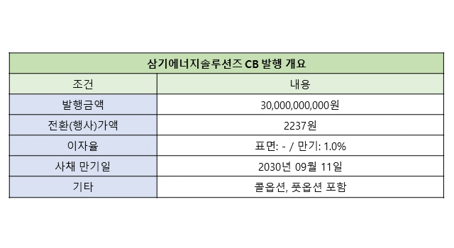 3일 금융감독원 전자공시시스템에 따르면 삼기에너지솔루션즈는 전날 300억원의 CB를 발행하기로 결정했다. 표면이자율은 0%, 만기이자율은 1%다. 발행대상은 △케이비증권 △미래에셋증권 △한국투자증권 △엔에이치투자증권 △삼성증권 △신한투자증권 등이 신탁업자인 28개 사모펀드다.