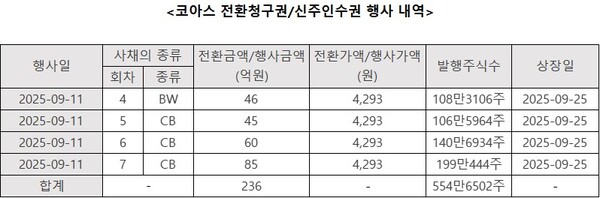 15일 금융감독원 전자공시시스템에 따르면 코아스는 전환사채(CB)의 전환청구권과 신주인수권부사채(BW)의 신주인수권이 이번달 11~12일에 걸쳐 행사됐다고 공시했다. CB는 190억원, BW는 46억원으로 236억원 규모의 물량이 주식으로 전환될 예정이다. 이번에 발행되는 신주는554만6502주로, 기존 발행주식 329만720주의 168%에 달한다. 신주는 오는 25일 상장된다.