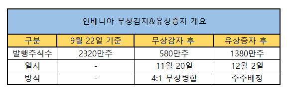 이어 인베니아는 주주를 대상으로 130억원 규모의 유상증자를 진행한다. 이번 발행 신주는 감자 후 주식 총수 대비 138%인 800만주로 증자 후 주식은 1380만주가 된다. 발행 예정가는 1633원으로 할인율 40%가 적용됐다. 내년 1월 8~9일 구주주 청약을 거쳐 같은 달 23일 신주를 상장할 예정이다.