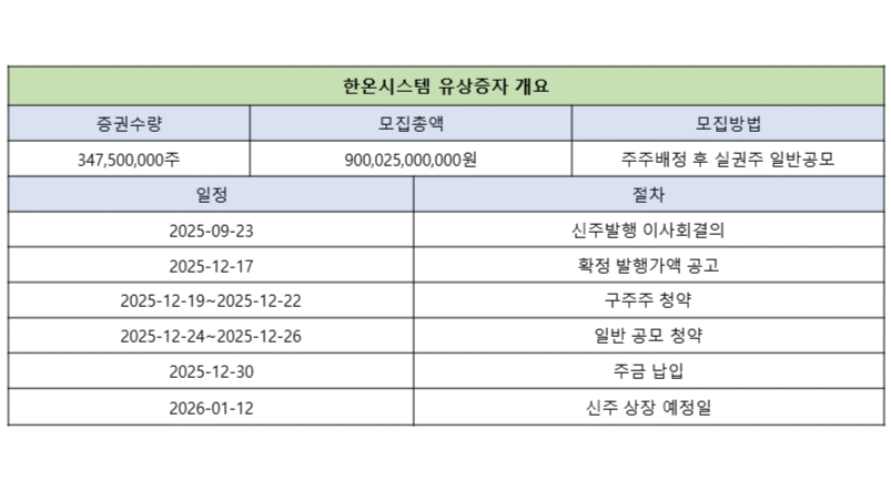 예정발행가액은 2590원으로 기준주가에 15% 할인됐다. 12월 16일에 최종발행가액이 결정되며, 12월 19~22일 구주주청약과 24~26일 일반공모 청약을 진행할 예정이다. 신주 상장일은 2026년 1월 12일이다.