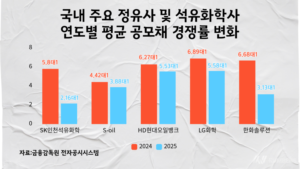 국내 주요 정유사와 석유화학사도 공모채 투자 심리가 1년 새 눈에 띄게 위축됐다. 지난해와 올해 순으로 공모채의 평균 경쟁률 변화를 살펴보면 △에쓰오일 4.42대1→3.88대1 △HD현대오일뱅크 6.27대1→5.53대1 △LG화학 6.89대1→5.58대1 △한화솔루션 6.68대1→3.13대1 등이다. 전체적으로 모집액은 줄어들었으며 만기가 길수록 흥행과 멀어지는 모습을 보였다.