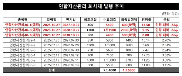 연합자산관리(유암코)가 올해 들어 내놓은 세 차례의 공모 회사채에 7조원이 넘는 뭉칫돈이 쏟아져 들어왔다. 매번 발행마다 조(兆) 단위 투자 수요를 이끌며 여유로운 자금 조달 행보를 이어갔