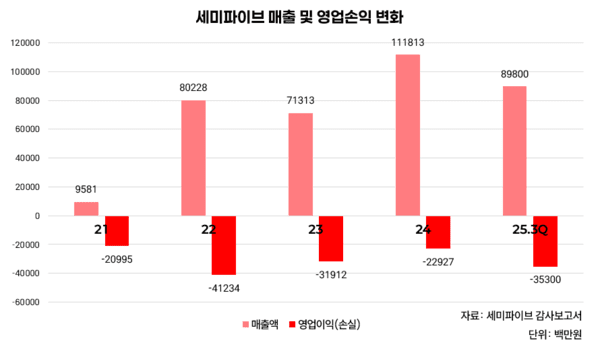세미파이브의 외형 성장세는 가파르지만 수익성 개선은 여전한 과제다. 회사는 2021년 매출 96억원, 2022년 802억원, 2024년 1118억 원을 기록하며 외형 성장을 이뤘다. 올해 3분기 누적 매출은 898억원에 달한다. 다만 지난해 229억원의 영업손실에 이어 올 3분기 누적 영업손실 353억원을 기록하는 등 적자 구조를 벗어나지 못하고 있다.