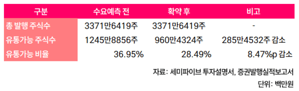 높은 확약 비율은 오버행(잠재적 매도 물량) 우려를 해소시켰다. 전체 주식수 3371만주 중 상장 후 유통 가능한 주식수는 1246만주(36.95%)로 예상했으나, 기관 확약 물량이 늘어나 실제 유통 가능 물량은 약 960만주로 줄어들었다. 전체 주식수 대비 28.49%로 8.48%p 감소한 수치다. 상장 6개월 후 유통가능 주식수는 2047만주(60.73%)가 될 예정이다.