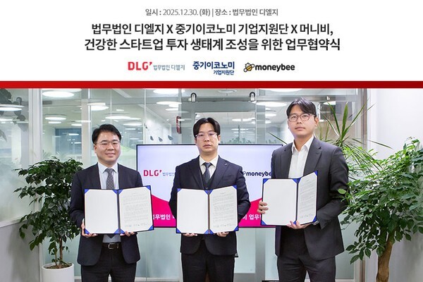 법무법인 디엘지가 30일 서울 서초동에 위치한 본사에서 컨설팅 그룹인 중기이코노미 기업지원단과 기업자금매칭 플랫폼 머니비와 ‘건강한 스타트업 투자 생태계 조성을 위한 3자 업무협약(MOU)’을 체결했다고 31일 밝혔다.
