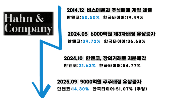 현재 구조상 약 3000억원은 추가로 확보 가능하다. 한앤코가 보유한 잔여 주식은 1억4679만5000주로 이 중 40%는 한국타이어를 상대로 풋옵션을 행사할 수 있다. 풋옵션 행사 기간은 2027년 1월 11일부터 2월 11일이다. 행사 가격은 주당 5200원으로 예상 회수 금액은 약 3053억원이다.