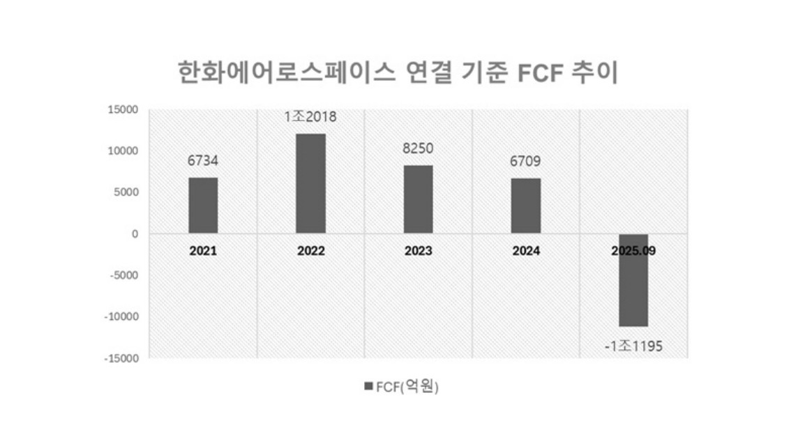 다만 FCF가 마이너스(-)로 돌아섰다는 점은 염려스러운 대목이다. 한화에어로스페이스의 FCF는 지난해 3분기 연결 기준 -1조1195억원을 기록했다. 그 전에는 △2021년 6734 △2022년 1조2018억원 △2023년 8250억원 △2024년 6709억원으로 꾸준히 플러스 흐름을 이어왔었다.