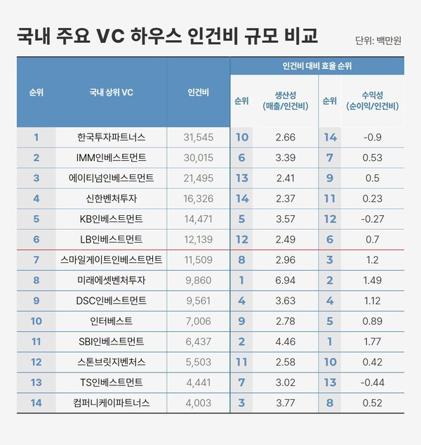 이번 조사는 한국투자파트너스, IMM인베스트먼트, 에이티넘인베스트먼트 등 국내 상위 VC 14곳을 대상으로 했다. 효율은 펀드 내부수익률(IRR)이 아닌 운용사 재무제표를 기준으로 인건비 대비 매출과 순이익을 비교한 지표다. 회수 성과에 따라 연간 실적 변동성이 큰 만큼, 인건비와 성과의 절대적인 규모보다 투입한 비용이 실제 성과로 얼마나 연결되고 있는지에 초점을 맞췄다.