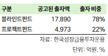 유형별로는 블라인드펀드가 1조7890억원으로 전체의 78%를 차지했다. 프로젝트펀드는 5074억원으로 22%다. 산업은행·기업은행 등 지정출자자와 재정모펀드의 합산 규모는 7555억원으로 집계됐다.