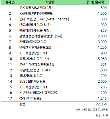 7일 <넘버스>가 성장금융의 ‘2025년 출자공고’를 집계한 결과, 지난해 총 17건의 사업을 통해 총 2조 2864억원 규모의 출자 계획을 공고했다. 은행권 중견기업 밸류업 펀드와 성장사다리펀드 등 계속 지원 사업을 포함한 수치다.