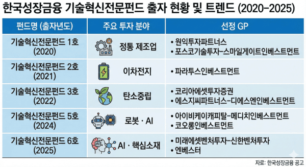 지난해 결성한 6호 기술혁신전문펀드 역시 5호와 유사했다. 첨단제조·AI 분야와 반도체·핵심소재 분야 기업 R&D에 투자하는 구조였다. 성장금융은 해당 펀드에 미래에셋벤처투자-신한벤처투자(Co-GP)와 엔베스터를 GP로 선정해 자펀드 결성을 맡겼다.