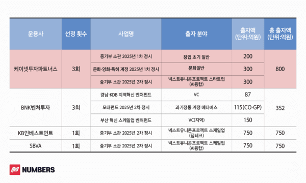 기사원문보기 ▼ [모태펀드 2025 결산]③ 3관왕 위업 '케이넷', 800억 받았다 - 넘버스지난해 모태펀드로부터 최대액을 출자받은 벤처캐피탈(VC)은 케이넷투자파트너스인 것으로 나타났다. 문화계정에서 유례없는 트랙레코드를 쌓아 2024년 모태펀드 결산www.numbers.co.kr 지난해 모태펀드로부터 최대액을 출자받은 벤처캐피탈(VC)은 케이넷투자파트너스인 것으로 나타났다. 문화계정에서 유례없는 트랙레코드를 쌓아 2024년 모태펀드 결산 시상식 3관왕에 오른 성과가 운용 역량에 대한 신뢰를 낳았고, 2025년 다수의 출자사업에 선정되는 결과로 이어졌다. 출자사업·출자규모 동시 1위가 2025년 모태펀드 출자사업 선정 내용을 비교·분석한 결과, 케이넷투자파트너스는 지난해 총 3개 출자사업에서 정책자..
